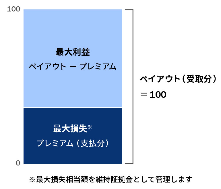売買レートの下限値と上限値が確定していますので、各取引の最大利益/最大損失額がポジション保有の時点で確定します(損益通貨が外貨建ての場合は為替レート変動分を除きます)。