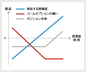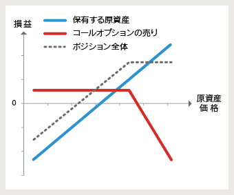 プレーンオプションを活用した投資戦略にカバード・コールがあります。カバード・コールは、原資産を保有しつつ、その原資産のコールオプションを売却する戦略です。原資産価格のボラティリティが低いという予測に基づき、原資産保有中の利回りを向上させようとするもので、原資産価格があまり変動しない、もしくは下落した場合の運用利回りはオプション売却により得たプレミアム分だけ向上します。半面、原資産価格が上昇した場合に得られる利益は限定されます。