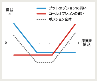 ロング・ストラングルは、権利行使価格の高いコールの買いと、権利行使価格の低いプットの買いの組み合わせです。原資産の価格が権利行使価格の近辺にあって、上下どちらかの方向へ大きく変動する可能性が高いと考えられる時に有効な投資戦略。コールとプットの購入であるため、原資産価格がそれぞれの損益分岐点を超えて上下に変動した場合に利益を得ることができます。