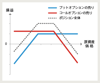 ショート・ストラングルは、権利行使価格の高いコールの売りと、権利行使価格の低いプットの売りの組み合わせです。この戦略は、原資産の価格が権利行使価格の近辺にあり、価格変動が限定的と考えられる時に有効です。コールとプットの売却であるため、原資産価格の変動がそれぞれの損益分岐点の範囲内にとどまった場合に利益を得ることができます。