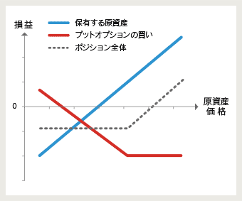 プレーンオプションを活用したヘッジ取引に、「プロテクティブ・プット」があります。原資産を買いポジションで保持しつつ、原資産のプットオプションを持ちます。オプションを購入して原資産価格が下落したときの損失を限定しながら、原資産価格が上昇しているときには値上がり益を得ようとする投資戦略です。