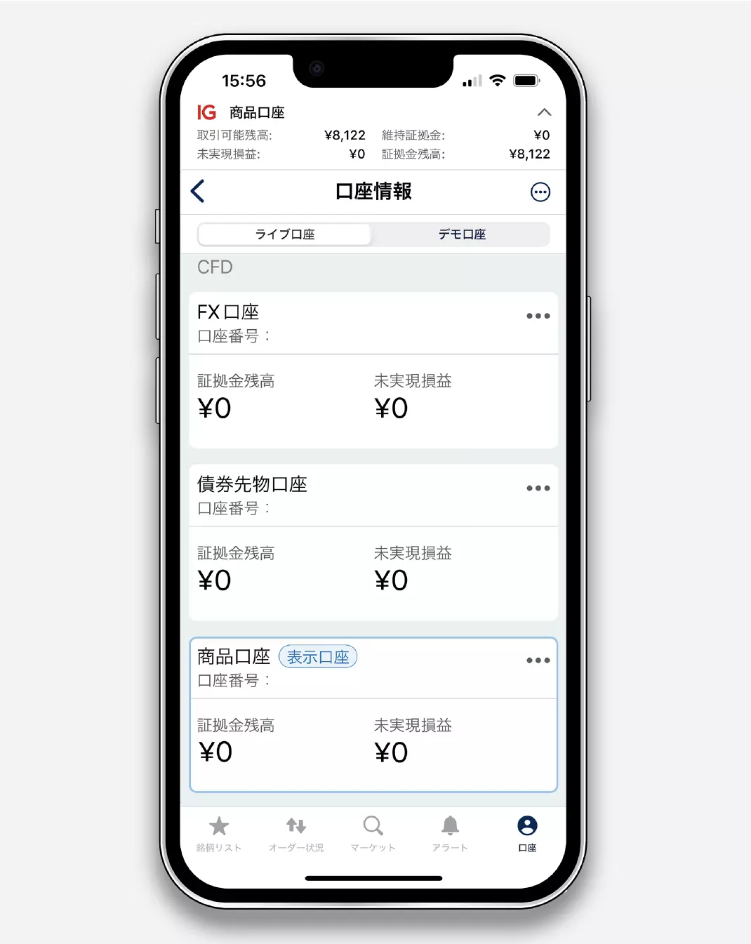 SAXOの取引アプリにログイン後、画面右下の「口座」をタップ。